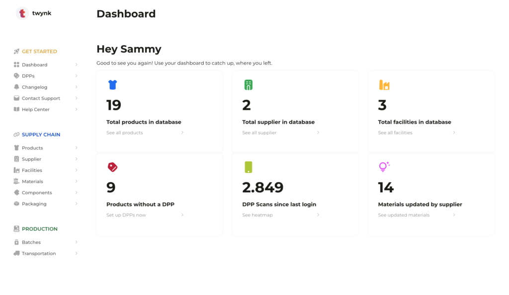 twynk brings all suppliers, materials, and product data into one system, automates lifecycle insights, and keeps every Digital Product Passport up to date automatically.