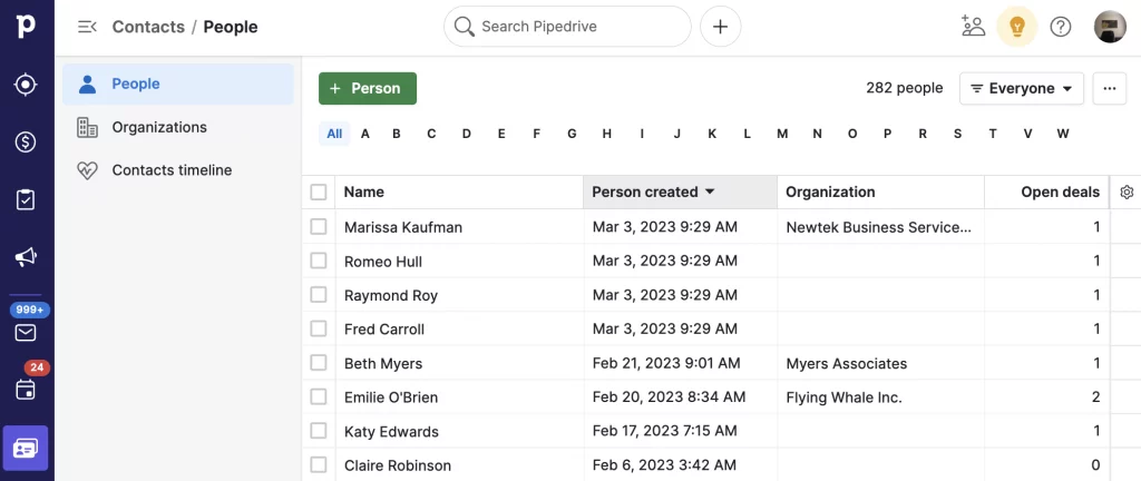 Kontakte in Pipedrive sind Personen, also Menschen, mit denen du Geschäfte machst oder machen möchtest. Pipedrive funktioniert wie ein Adressbuch 2.0. Warum 2.0? Anders als in einem herkömmlichen Adressbuch, in dem du lediglich Name, E-Mail und Telefonnummer speicherst, bietet dir Pipedrive jederzeit einen umfassenden Überblick über alle wichtigen Informationen (Notizen, vergangene und zukünftige Aktivitäten, E-Mails usw.), die mit der Person verbunden sind.