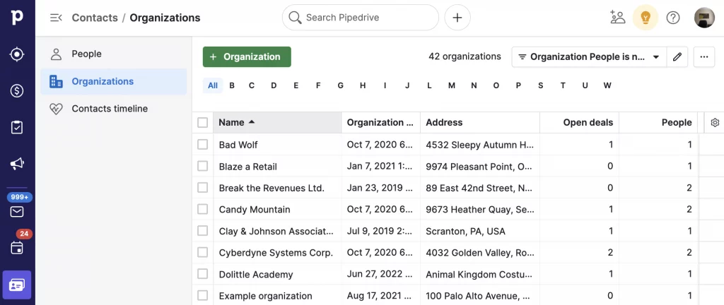 Organisationen sind die Unternehmen, bei denen deine Kontaktpersonen tätig sind. Jeder Kontakt, der einem Unternehmen zugeordnet ist, wird in dessen Detailansicht angezeigt, einschließlich aller Notizen und Aktivitäten, die mit den Kontakten, Leads, Deals oder Projekten des Unternehmens verbunden sind.