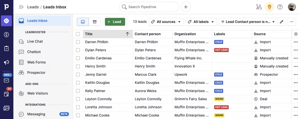 Der Lead-Posteingang von Pipedrive bietet dir einen speziellen Bereich, wo du deine Leads so lange parken kannst, bis du sie qualifiziert hast. Sobald du einen Lead kontaktiert und qualifiziert hast, entscheidest du, ob der Lead archiviert werden kann oder ob er zu einer echten Verkaufschance auf deiner Sales-Pipeline wird.