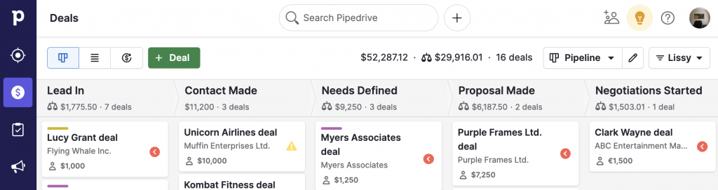 Aktive Geschäftsbeziehungen mit Kontakten oder Organisationen, also alle Leads, die tatsächliches Umsatzpotenzial haben, werden in Pipedrive als Deals gespeichert. Diese Deals durchlaufen verschiedene Phasen deiner Pipeline, bis sie am Ende des Sales-Funnels entweder als gewonnen (Kund:in kauft) oder als verloren (Kund:in kauft nicht) markiert werden.
