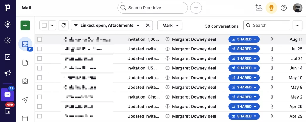 Antworten von deinen Kontakten werden direkt an deinen Pipedrive-Eingang weitergeleitet und von Pipedrive im selben E-Mail-Thread wie die ursprüngliche Nachricht erfasst. E-Mail-Anhänge sind überall zugänglich, wo die E-Mail verlinkt ist, einschließlich der Dateien-Registerkarte auf jeder Detailseite.